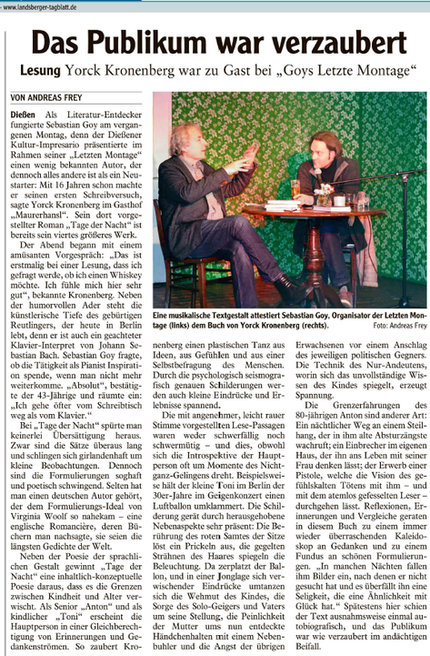 Yorck Kronenberg wurde 1973 geboren. Er studierte Klavier und Komposition in Lübeck. Als Pianist Gewinner des Internationalen Wettbewerbs J.S. Bach in Saarbrücken 1998. Zahlreiche CD-Veröffentlichungen. Er veröffentlichte drei Romane: „Welt unter“, Ex voto“ und „Was war“, darüber hinaus Kurzgeschichten in Anthologien. Stipendien u.a. bei der Stiftung Niedersachsen, dem Künstlerhaus Lukas in Ahrenshoop und dem Literarischen Colloquium Berlin.